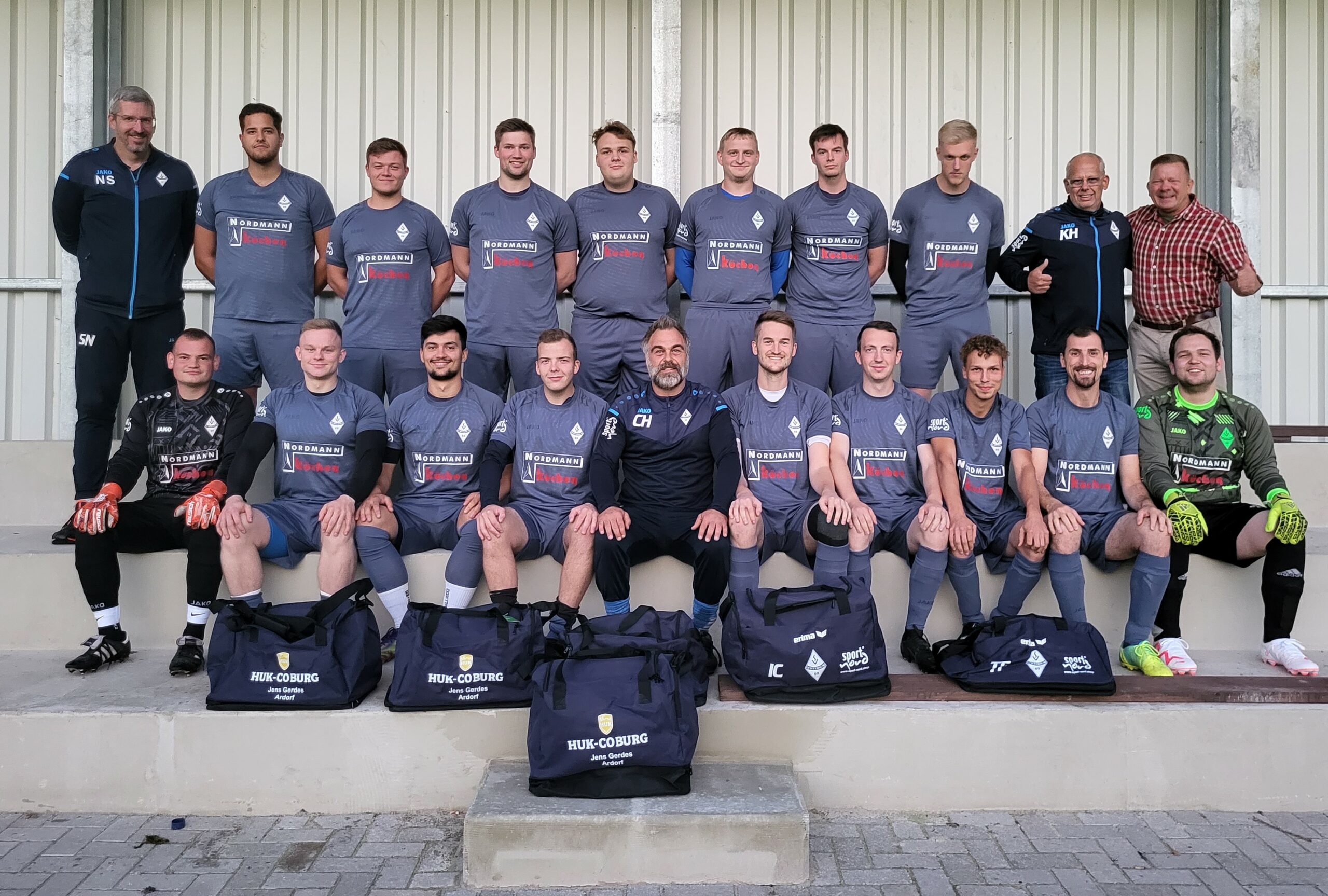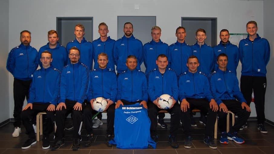 obere Reihe v.l.n.r.: Norman Stege (Co-Trainer), Cann Mariani, Henrik Janssen, Andre Freudenberg, Timo Isenecker, Steffen Coordes, Luca Poppen, Hanno Gerdes, Klaus Haupt (Fußballobmann), Jens Gerdes (Sponsor)